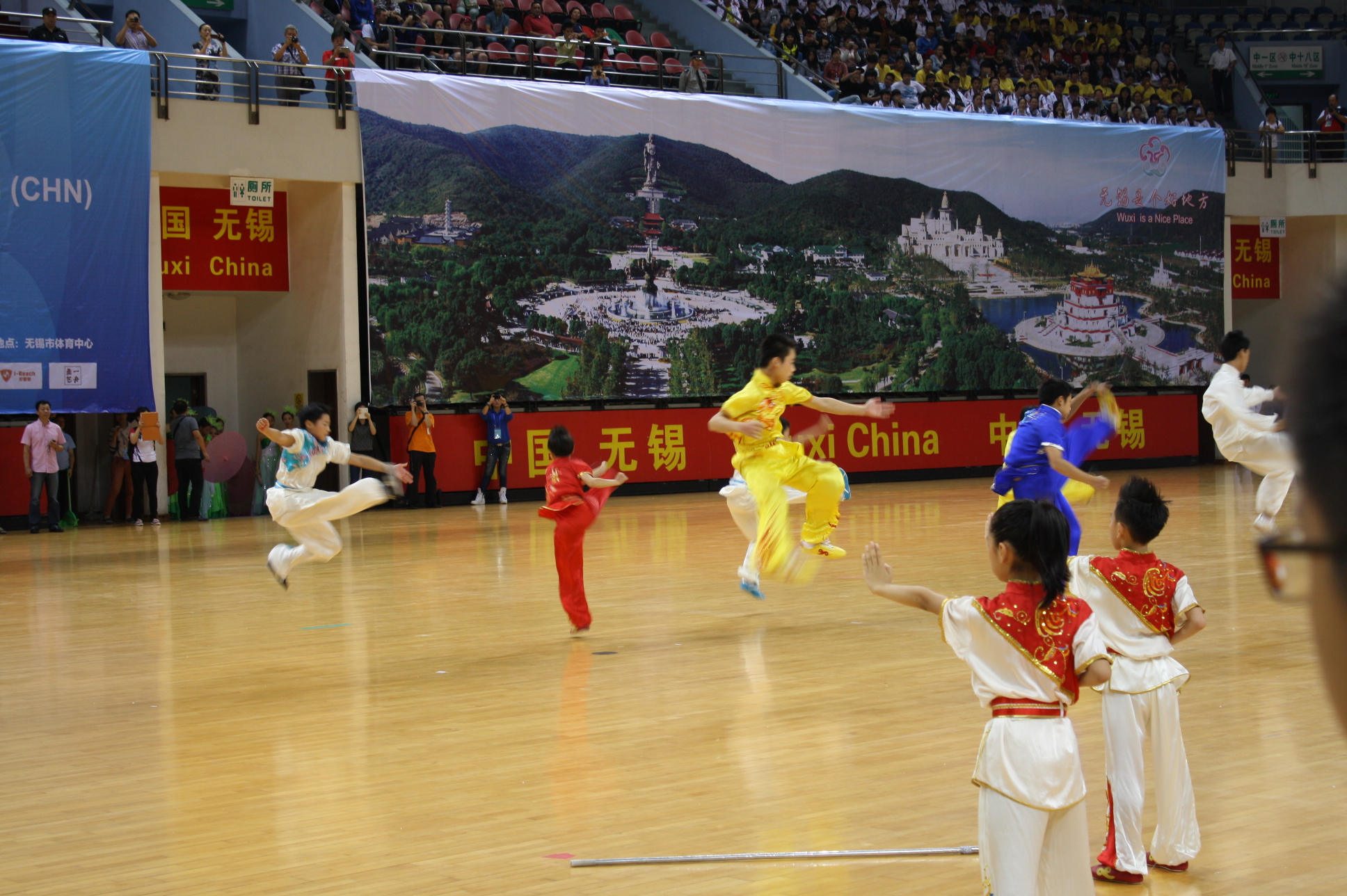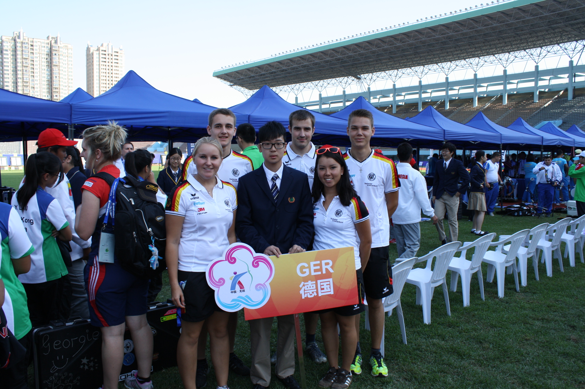 In China ist einiges anders. So war auch heute die Eröffnungsfeier morgens und nicht wie meist abends. In einer riesigen Sporthalle kamen alle Nationen zusammen. Jede hatte ihren persönlichen Schildträger, der streng nach Vorschrift seine Arbeit verrichtete. Wir staunten nicht schlecht, als wir die Halle betraten. Fast die komplette Tribüne war voll von Menschen, wenn auch ca. die Hälfte davon „gekauft“ war. Aber so konnte man sich wenigstens einen kurzen Augenblick wichtig fühlen. Diese „gekaufte“ Hälfte der Zuschauer waren vermutlich Schüler der Sportschule und haben ein paar Stunden schulfrei für die Eröffnungsfeier bekommen.